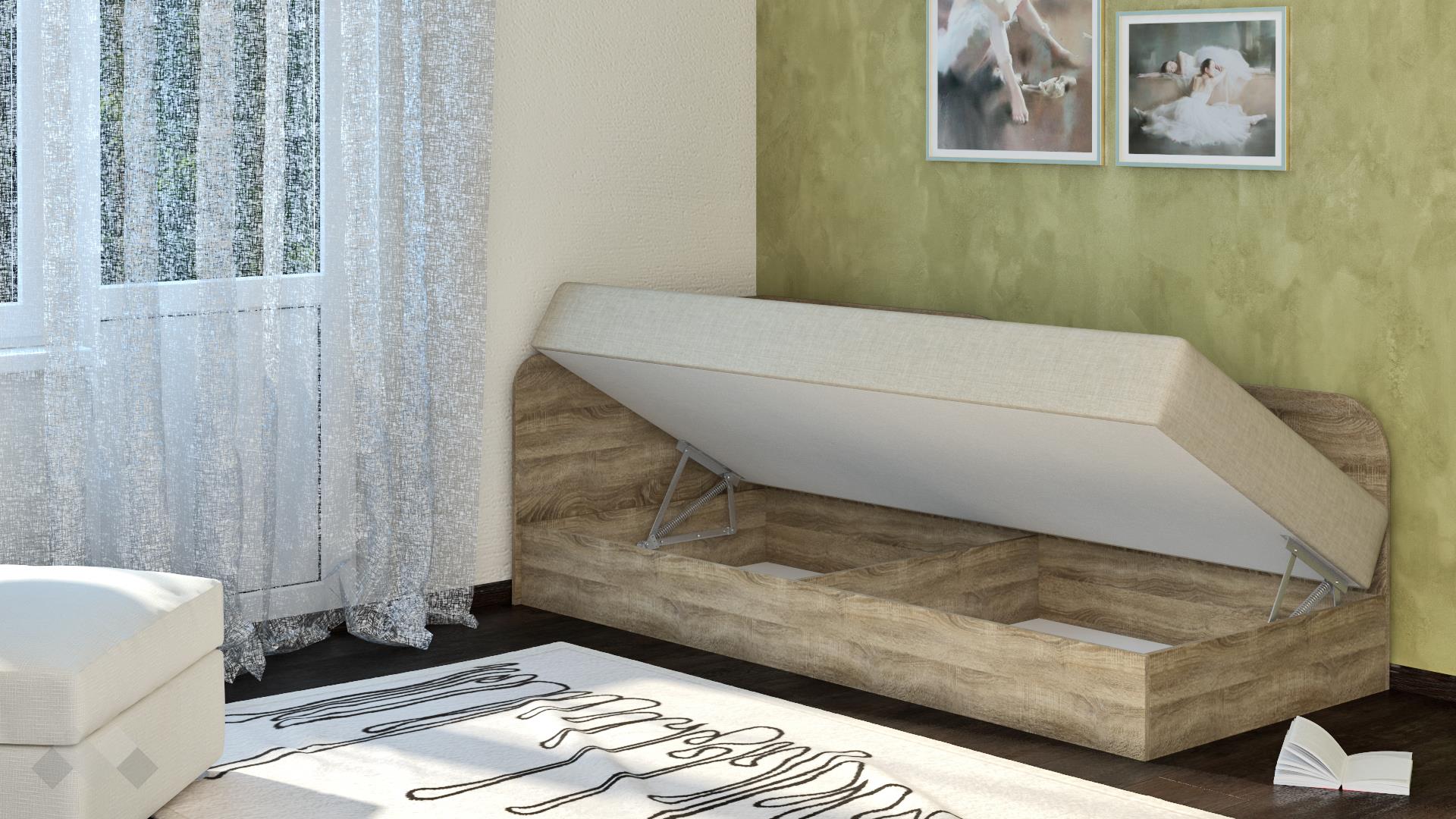 Леглото е подходящо за матрак с размер 82/190 см. Включеният в комплекта повдигащ пружинен механизъм повдига матрака и открива широко пространство, готово да побере всички възглавници и завивки, на които все не се намира място. Допълнителният делител на подматрачното пространство прави организацията на съхраняваните вещи още по-лесна. Така не се налага да закупуваш допълнителни шкафове у дома и ще спестиш пространство и пари.