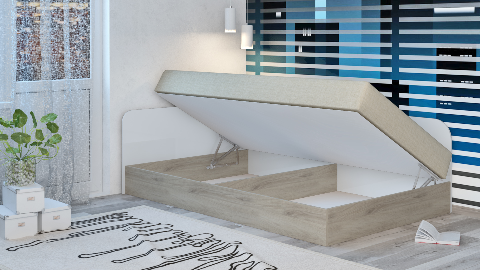 Леглото е подходящо за матрак с размер 120/190 см. Включеният в комплекта повдигащ пружинен механизъм повдига матрака и открива широко пространство, готово да побере всички възглавници и завивки, на които все не намираш място. Така не се налага да закупуваш допълнителни шкафове у дома и пестиш пространство и пари.