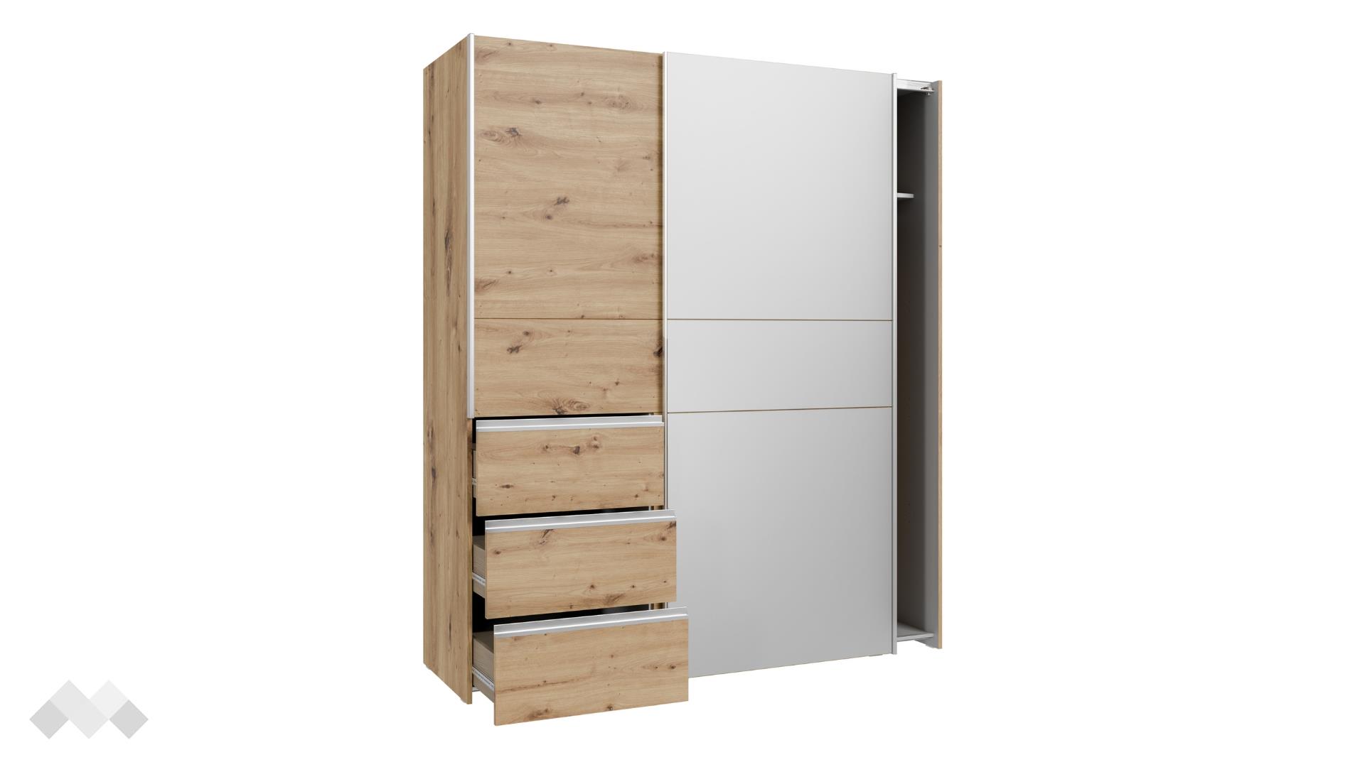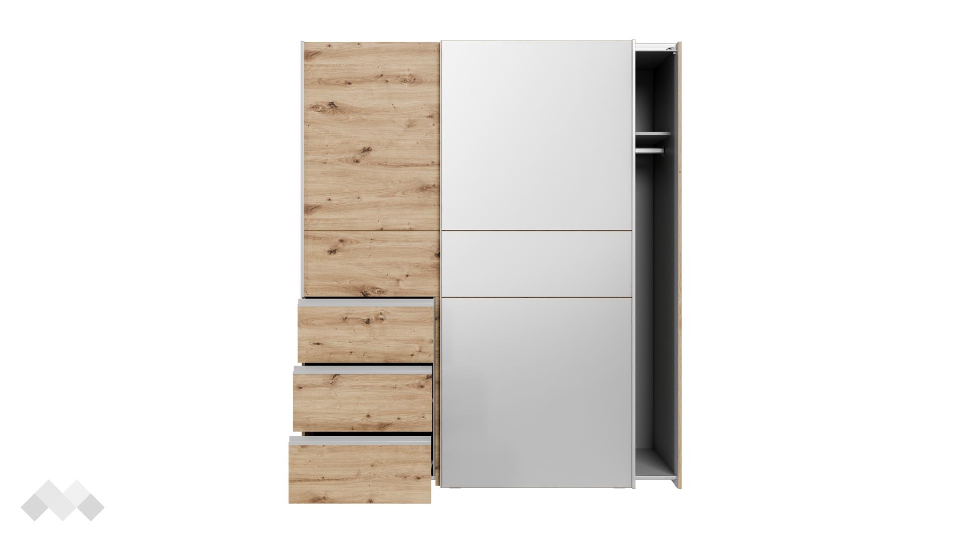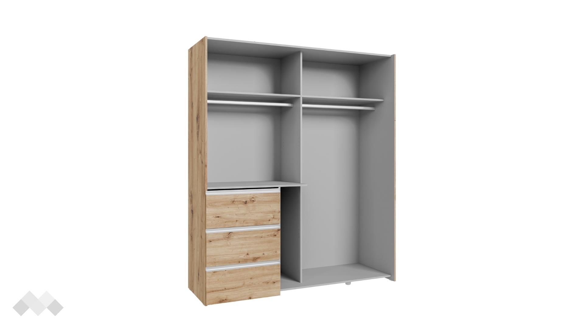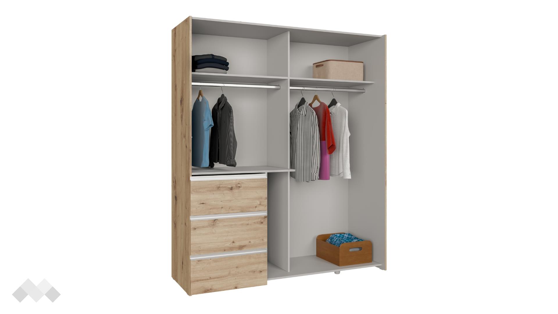 Разполага с две плъзгащи врати, които осигуряват лесен достъп до вътрешността, без да заемат допълнително място при отваряне. Вътрешната част е организирана с лост за закачалки и отделения за сгънати дрехи. Допълнителните три чекмеджета в долната част предоставят допълнително място за съхранение на бельо, аксесоари или други вещи.