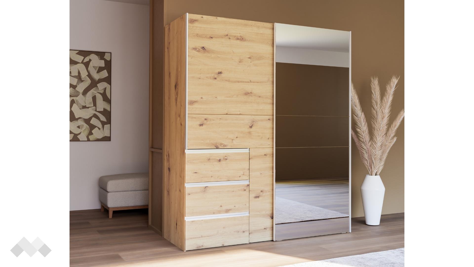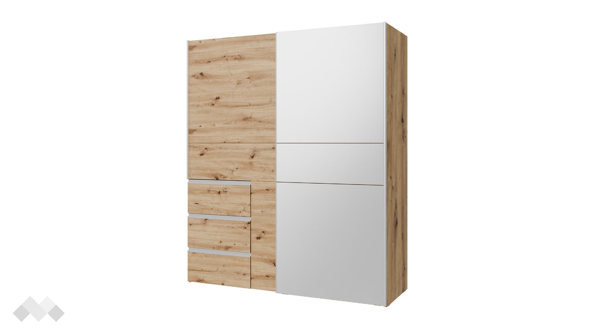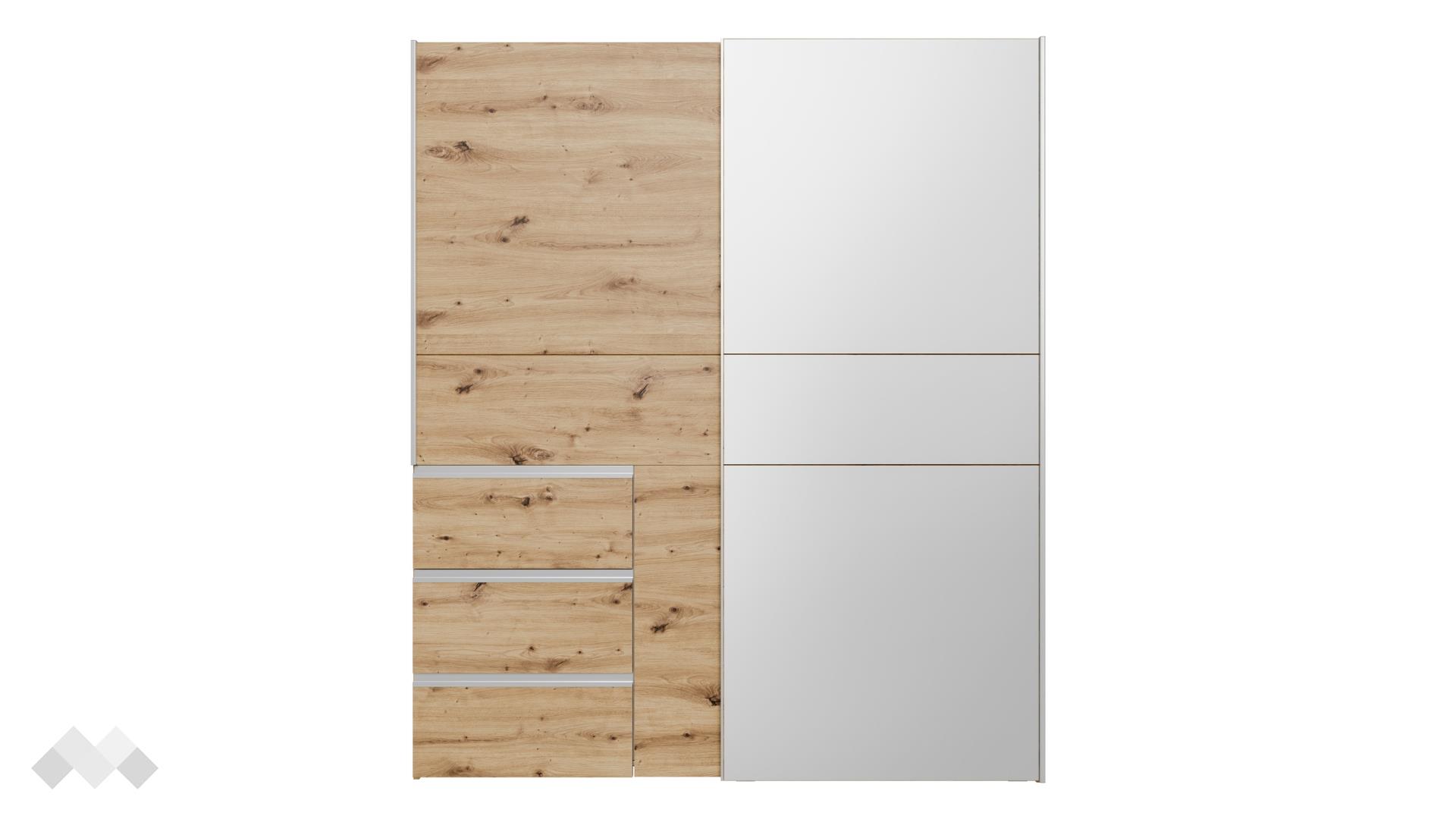 Разполага с две плъзгащи врати, които осигуряват лесен достъп до вътрешността, без да заемат допълнително място при отваряне. Вътрешната част е организирана с лост за закачалки и отделения за сгънати дрехи. Допълнителните три чекмеджета в долната част предоставят допълнително място за съхранение на бельо, аксесоари или други вещи.