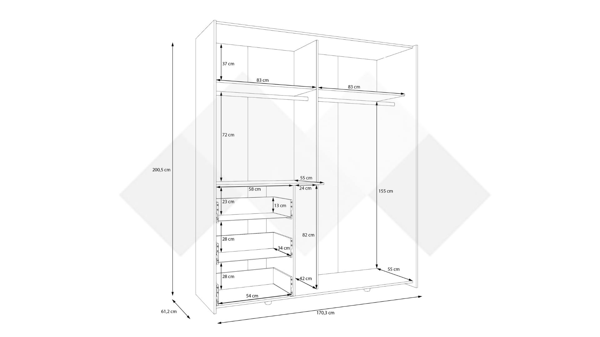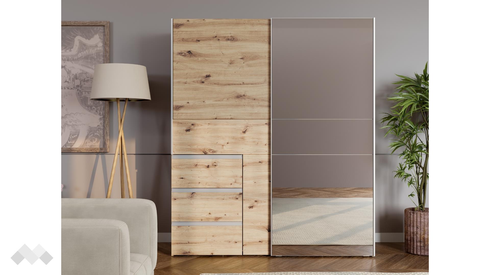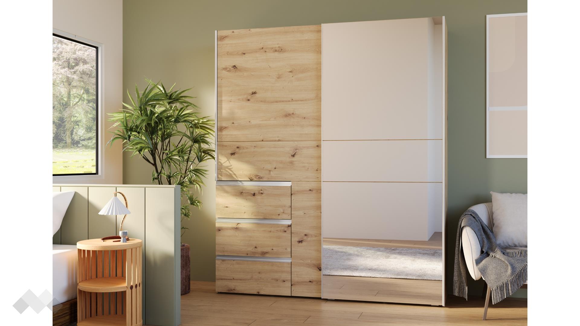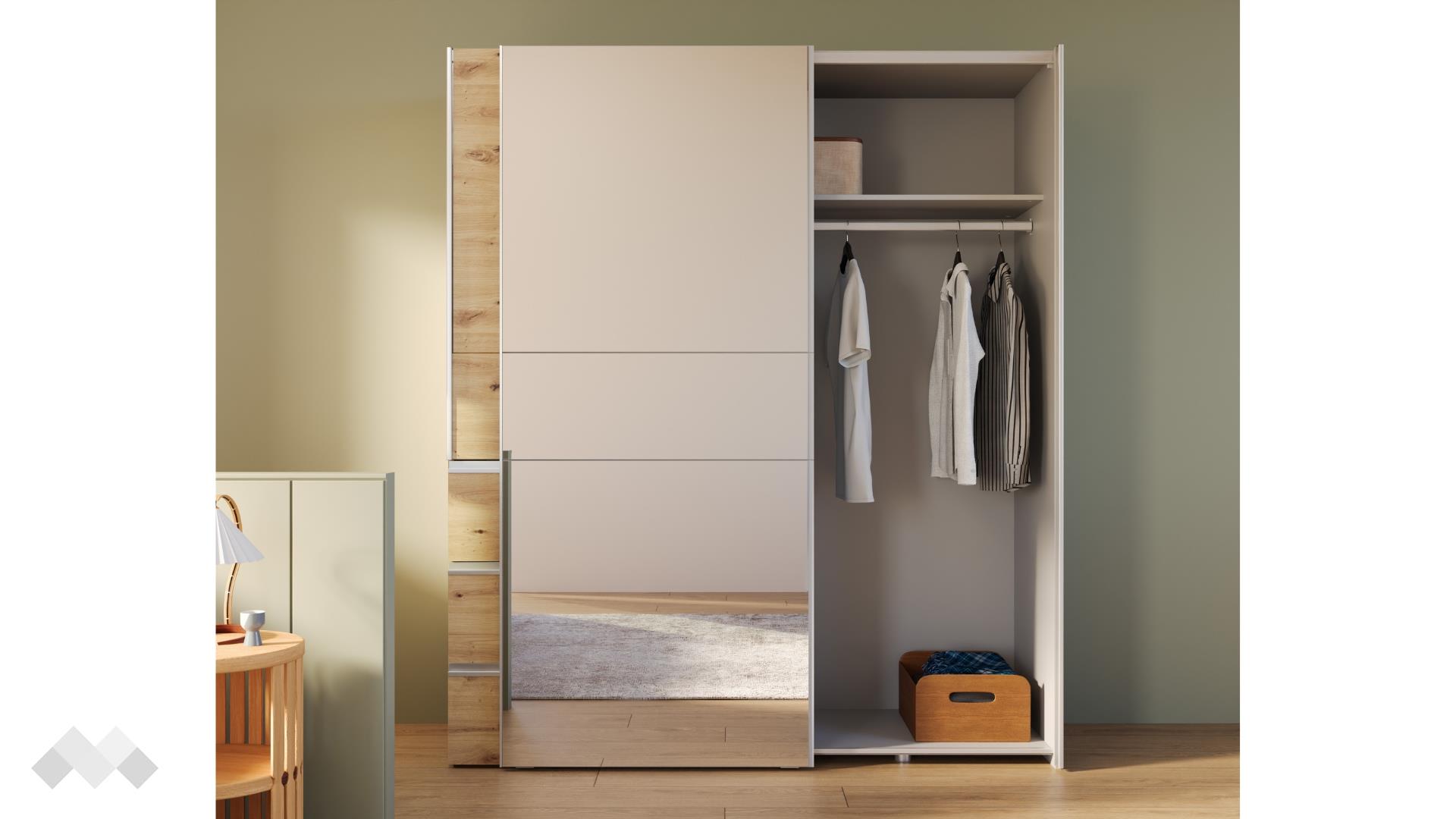 Разполага с две плъзгащи врати, които осигуряват лесен достъп до вътрешността, без да заемат допълнително място при отваряне. Вътрешната част е организирана с лост за закачалки и отделения за сгънати дрехи. Допълнителните три чекмеджета в долната част предоставят допълнително място за съхранение на бельо, аксесоари или други вещи.