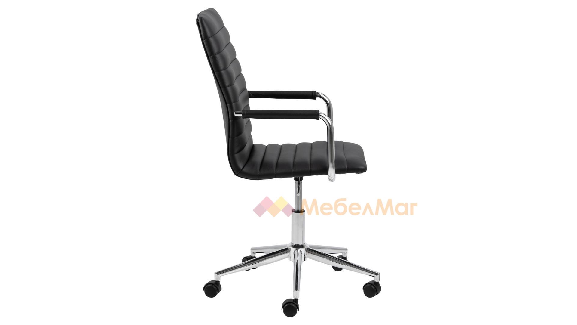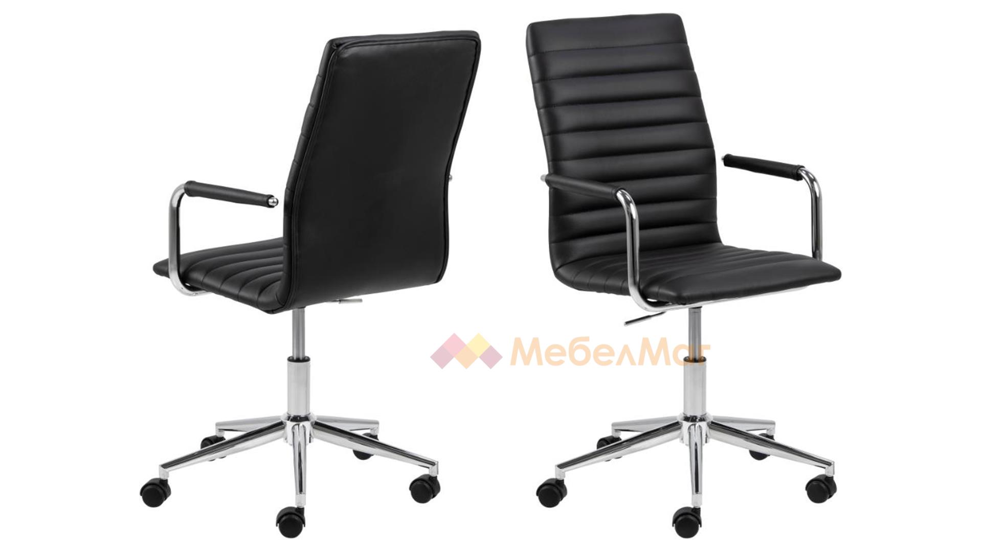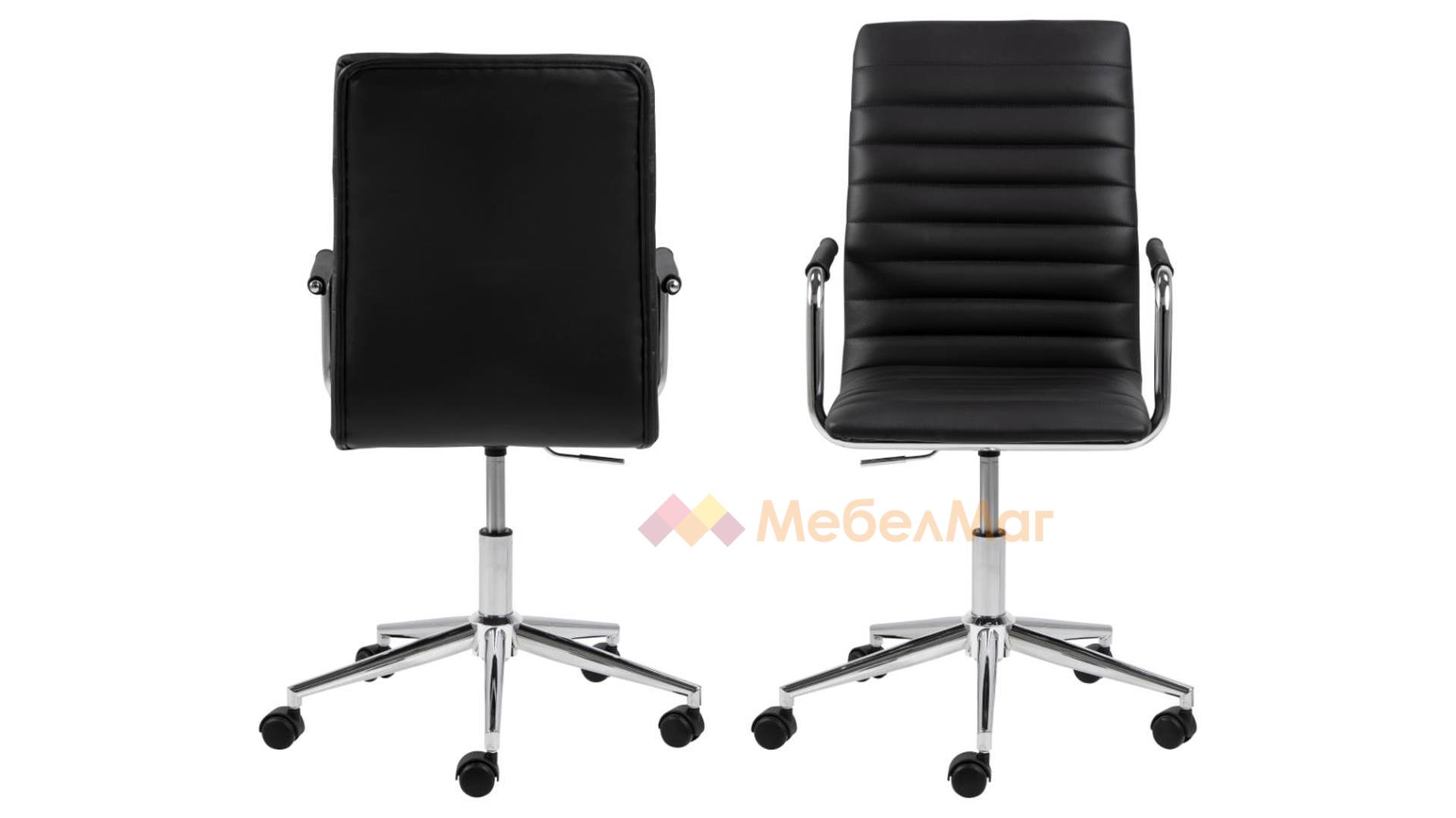 Има нещо в този класически офис стол - издължената обелгалка проектирана с тънък, елегантен силует. Седалката е покрита с черен плат от изкуствена кожа и допълнена от хоризонтални шевове.