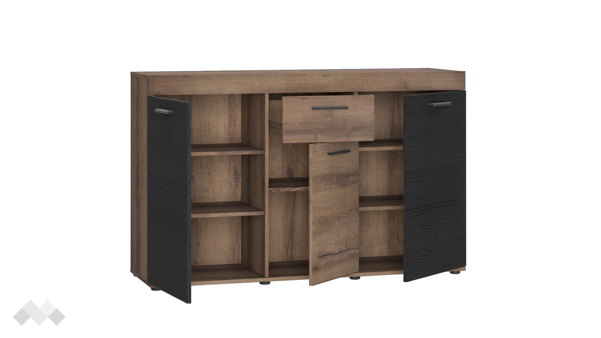 Трите врати разкриват просторно вътрешно пространство, подходящо за подреждане на дрехи, текстил или кутии с лични вещи. Чекмеджето предлага бърз и лесен достъп до най-необходимите предмети, като същевременно запазва изчистената визия на стаята.