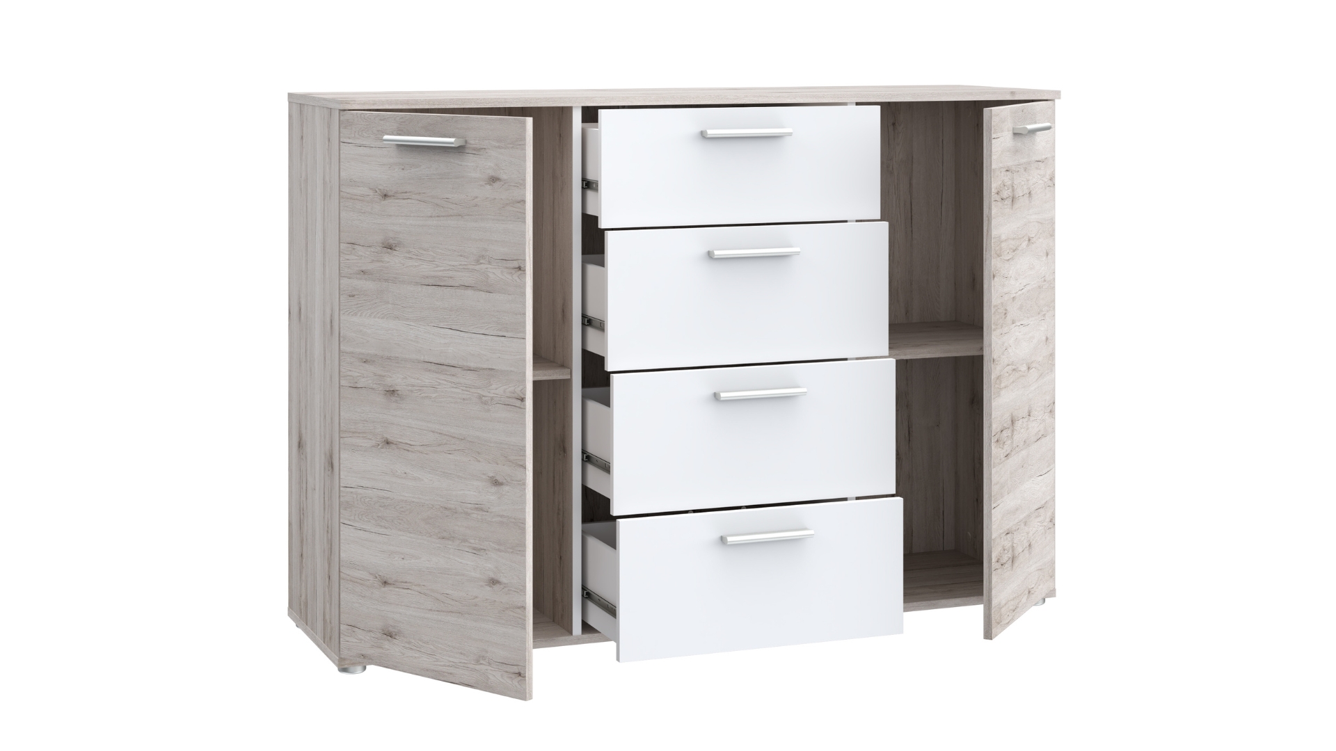 Скрин Валери е практично и стилно решение за организиране на вещите в дома. Със своите четири чекмеджета и два шкафа, той предлага изобилие от място за съхранение – от дрехи и спално бельо до документи и лични принадлежности.
