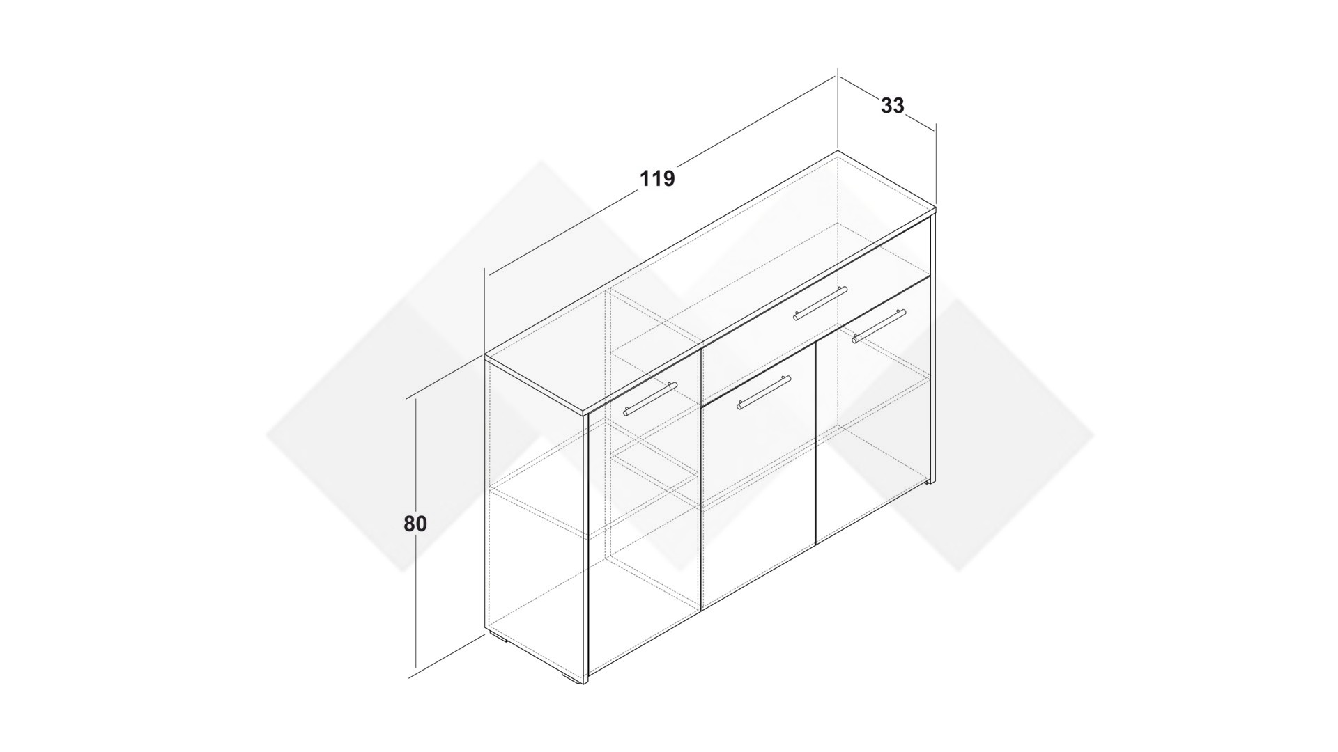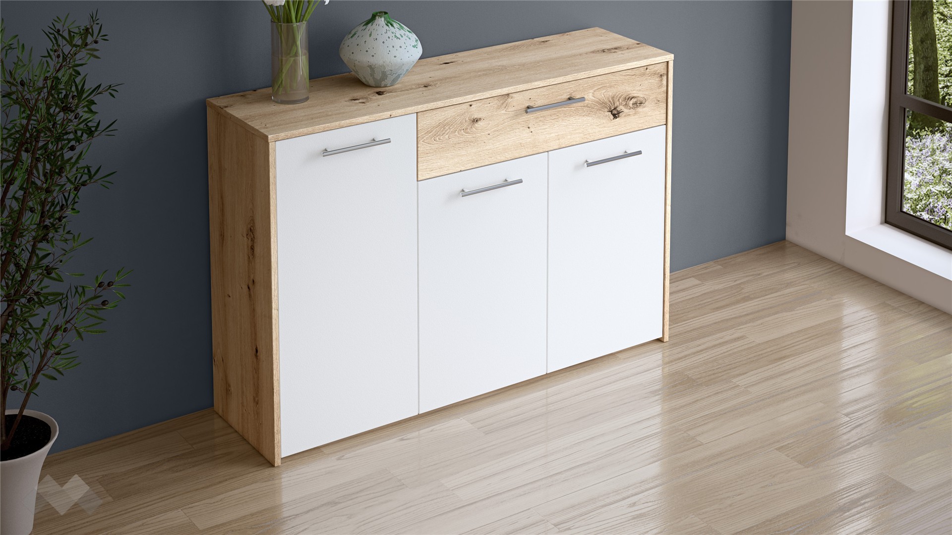 Скрин Вангард ще те впечатли с изчистени форми, модерен дизайн и функционално разпределение. На твое разположение са чекмедже и два затворени шкафа. Моделът ще ти предостави допълнително място за съхранение на дрехи и бельо, а върху горния плот може да подредиш козметика, аксесоари или ефектна декорация.
