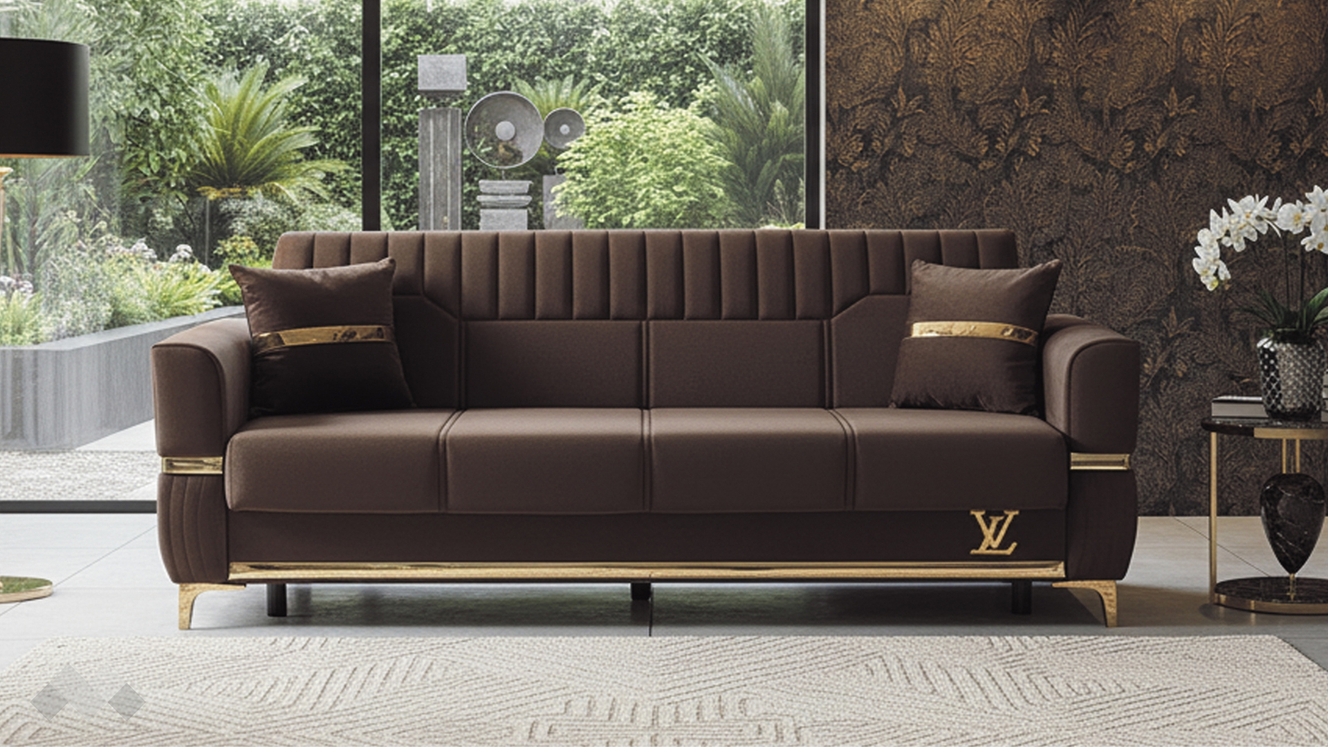 Облегалката е с изчистени вертикални шевове, които подчертават модерната линия на модела, а подлакътниците са декорирани със златисти орнаменти и вертикални шевове, които придават релефна текстура, добавящи допълнителен характер.