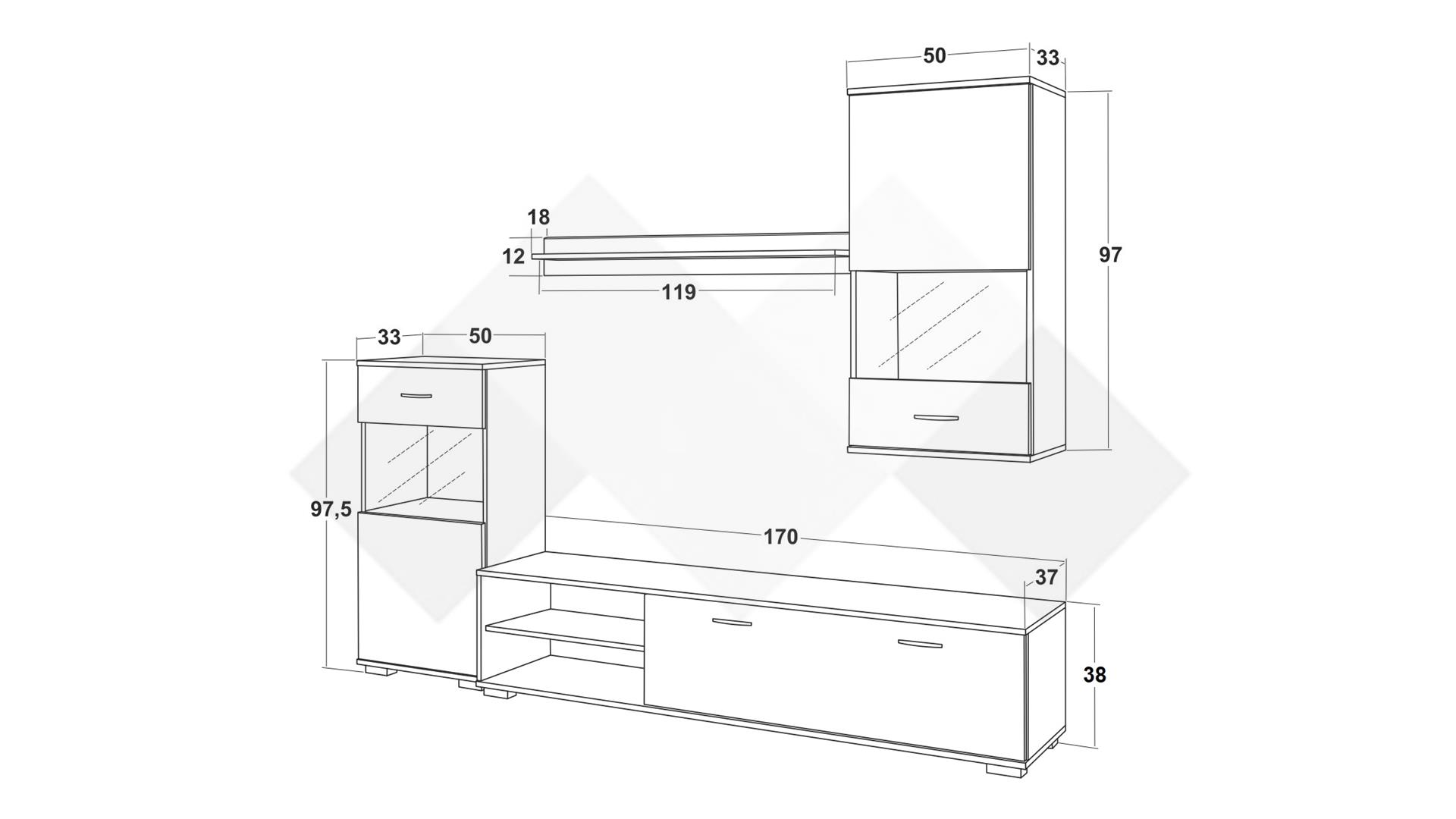 ТВ шкаф: Д: 170 см. Ш: 37 см. В: 38 см.