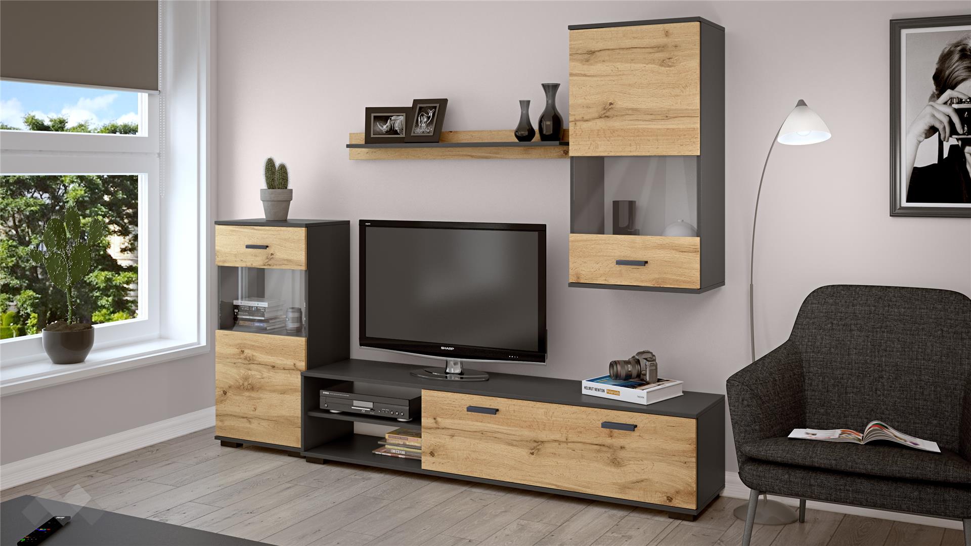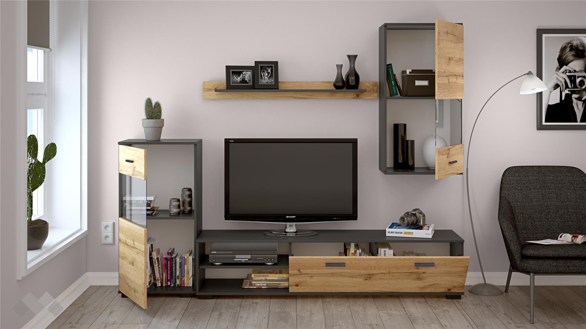 ⭐ Предимства: ✓ 2 отворени рафта ✓ ТВ шкаф ✓ висок шкаф ✓ окачен шкаф ✓ етажерка ✓ модерен дизайн ✓ функционална и практична ✓ качествена изработка ✓ 16 мм ПДЧ