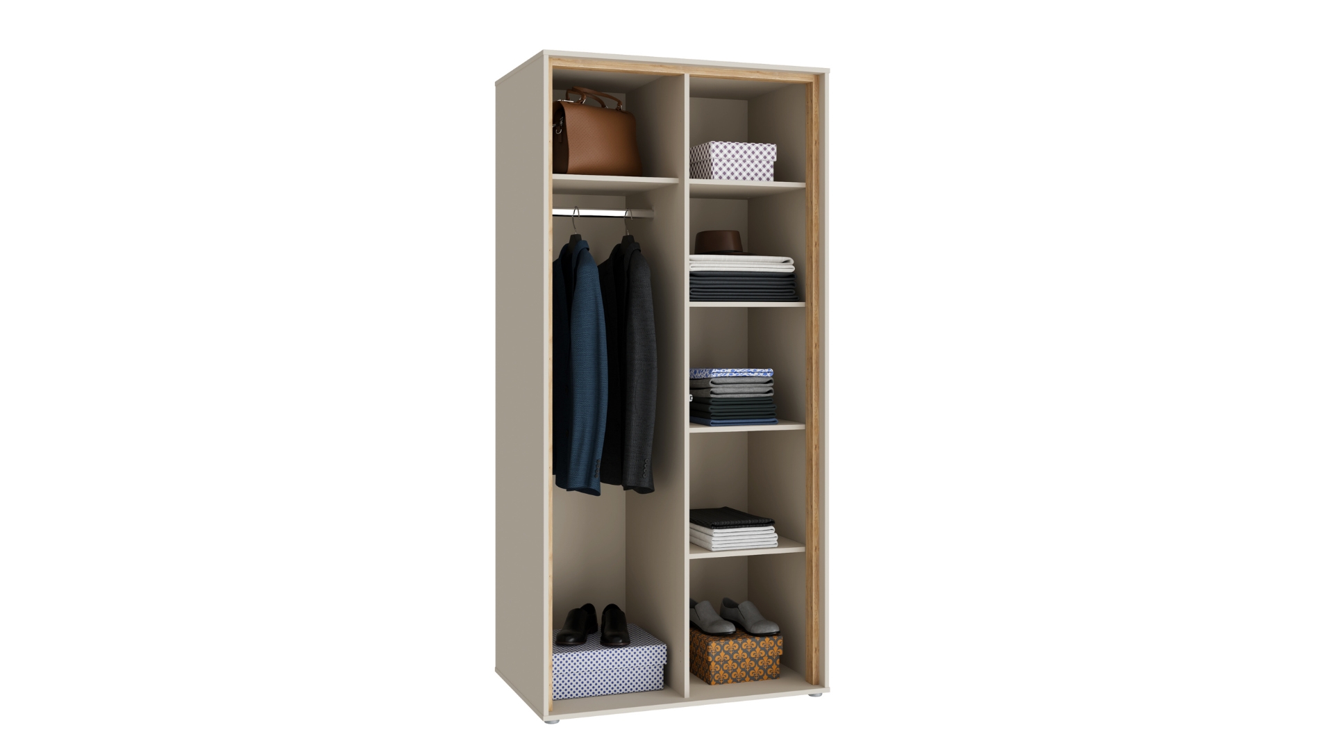 Този гардероб впечатлява със своето оптимално разпределение на вътрешното пространство. Разполага с общо 5 рафта, които осигуряват достатъчно място за подреждане на сгънати дрехи, спално бельо, кутии и други вещи. В допълнение, гардеробът включва лост за закачалки, идеален за съхранение на по-дълги дрехи като рокли, палта или костюми, предпазвайки ги от намачкване.