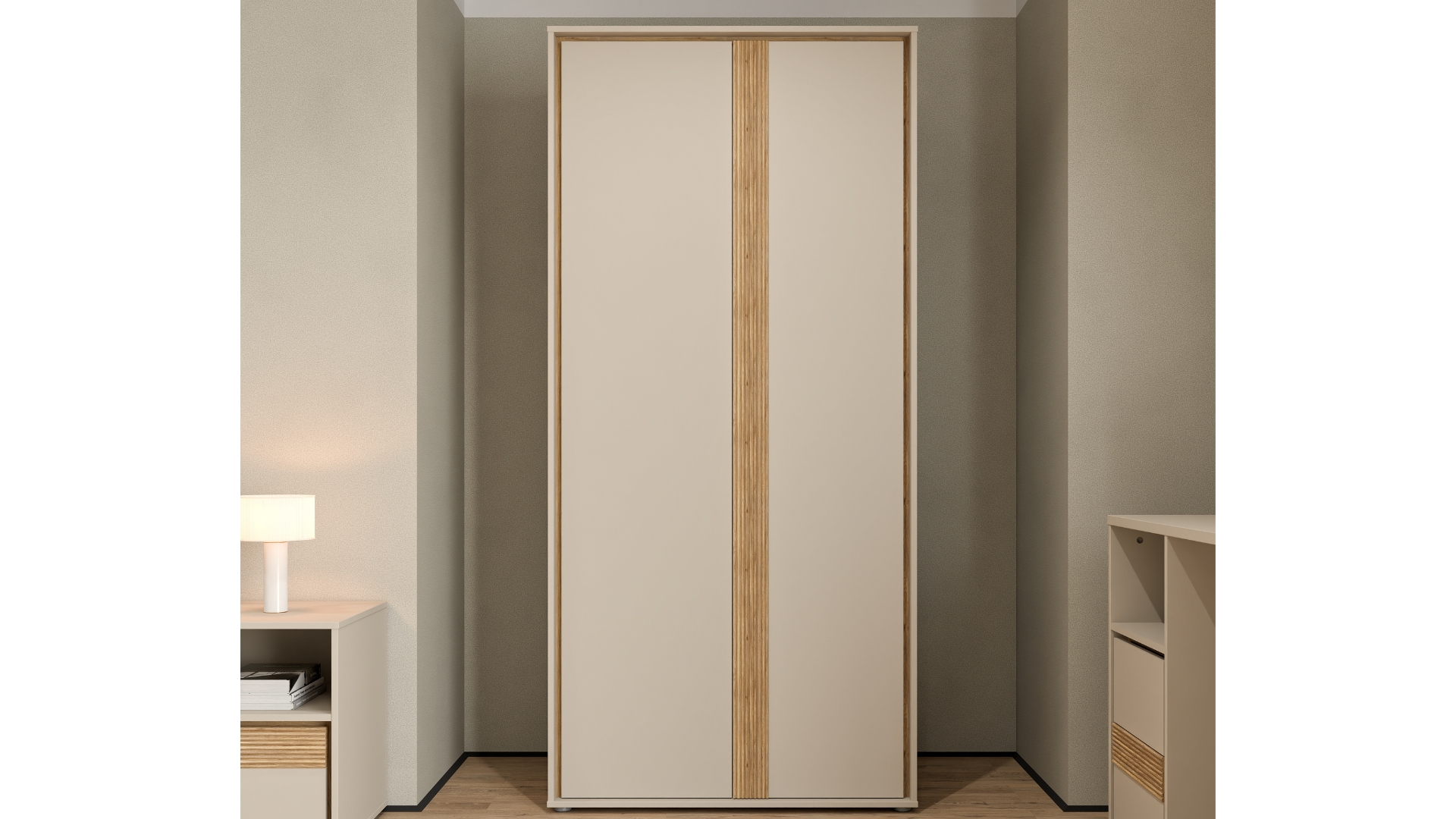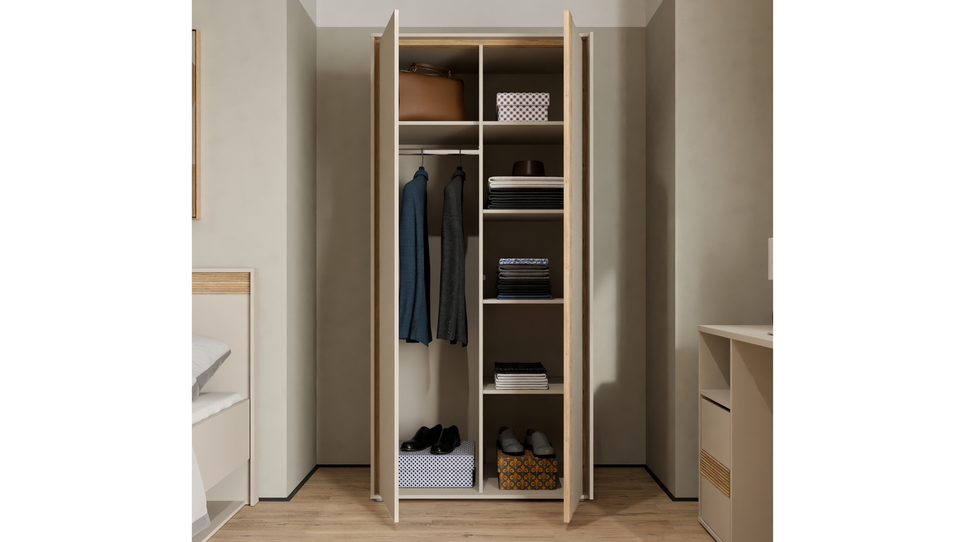 Гардеробът Векслин е идеалното решение за всеки, който търси модерен, функционален и добре организирано място за съхранение на дрехи и аксесоари. Двете врати снабдени с пуш механизъм, осигуряват леко и безшумно отваряне и затваряне с едно натискане, което допринася за изчистения дизайн без дръжки.