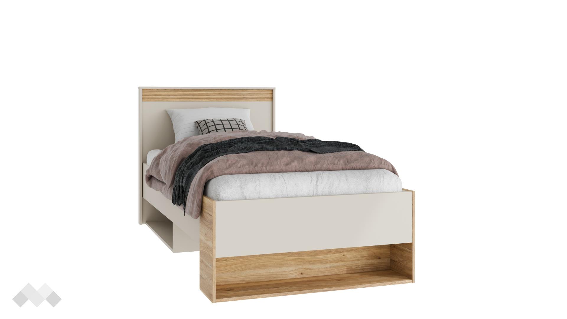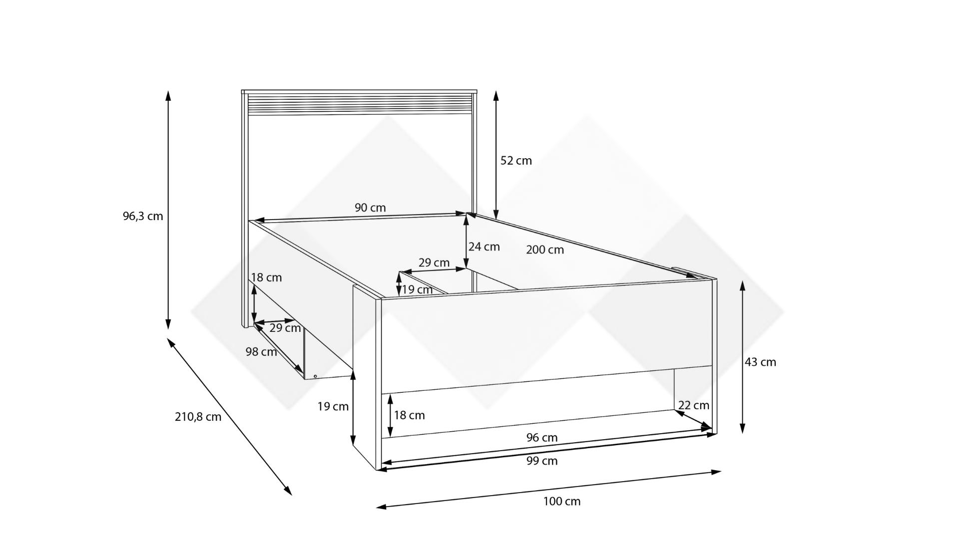 Леглото е проектирано за еднолицев матрак с размер 90/200 см, осигурявайки комфорт и удобство за сън. Едно от основните предимства на модела е вграденото чекмедже под матрака, което предоставя изключително удобно и дискретно място за съхранение на спално бельо, играчки, книги или други вещи, оптимизирайки пространството в стаята. Чекмеджето е снабдено с пуш механизъм, осигуряващ леко и безшумно отваряне и затваряне с едно натискане, което допринася за изчистения дизайн без дръжки.