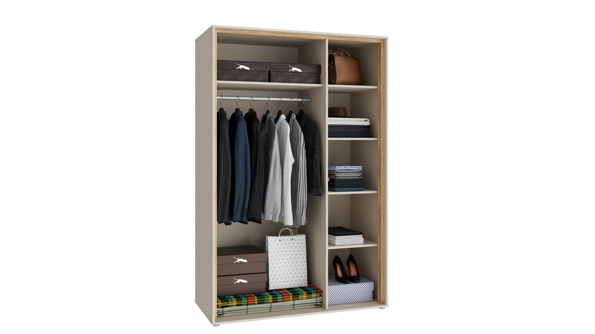 Този гардероб впечатлява със своето оптимално разпределение на вътрешното пространство. Разполага с общо 5 рафта, които осигуряват достатъчно място за подреждане на сгънати дрехи, спално бельо, кутии и други вещи. В допълнение, гардеробът включва лост за закачалки, идеален за съхранение на по-дълги дрехи като рокли, палта или костюми, предпазвайки ги от намачкване.