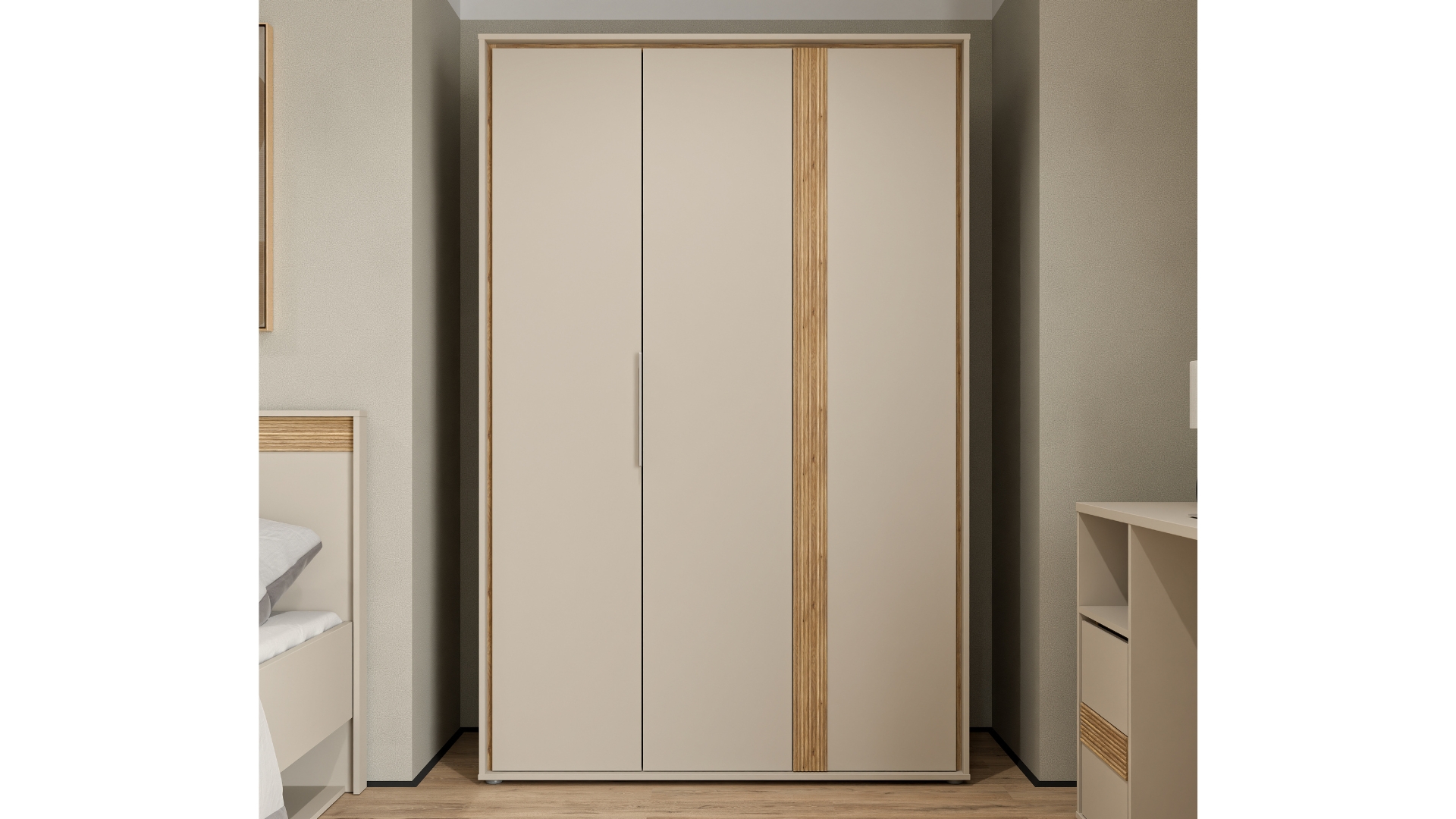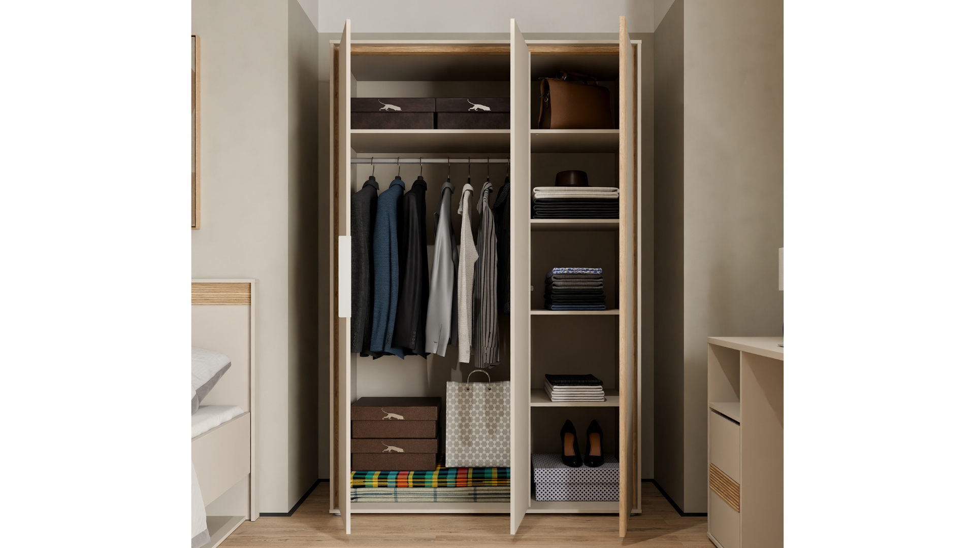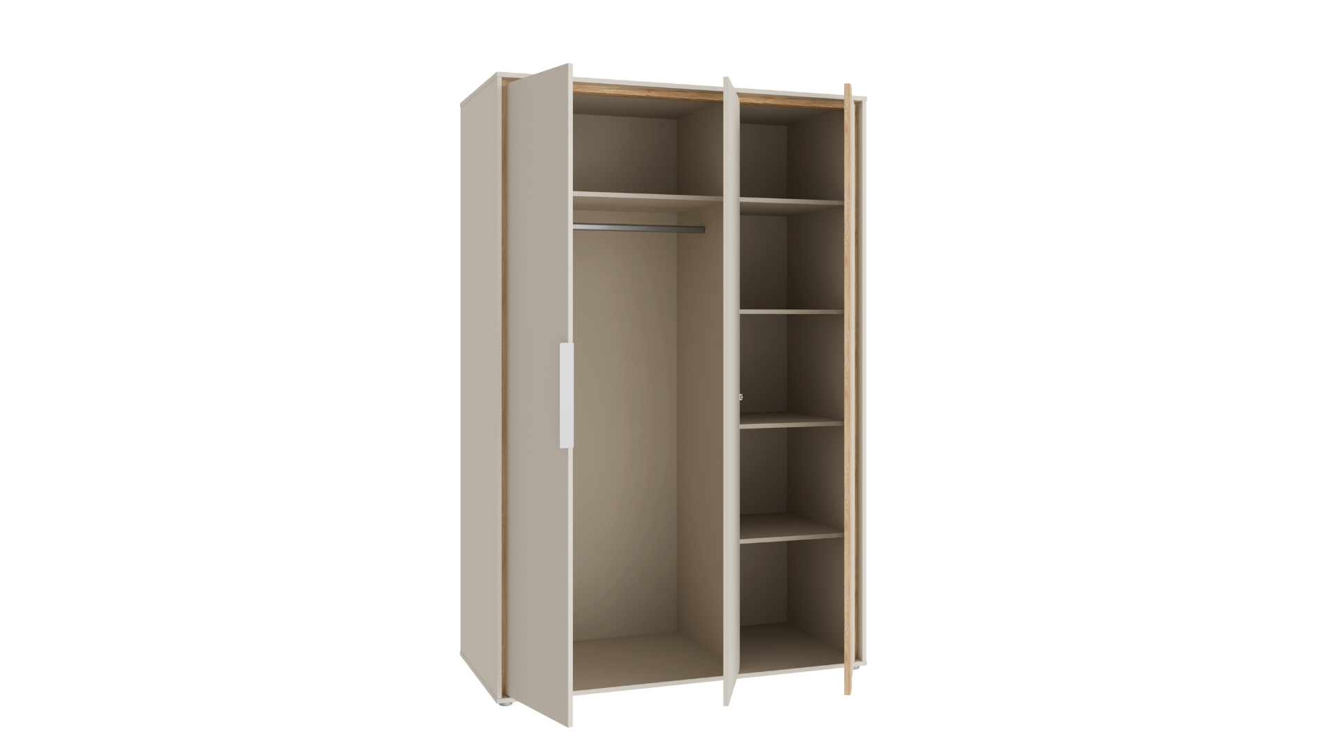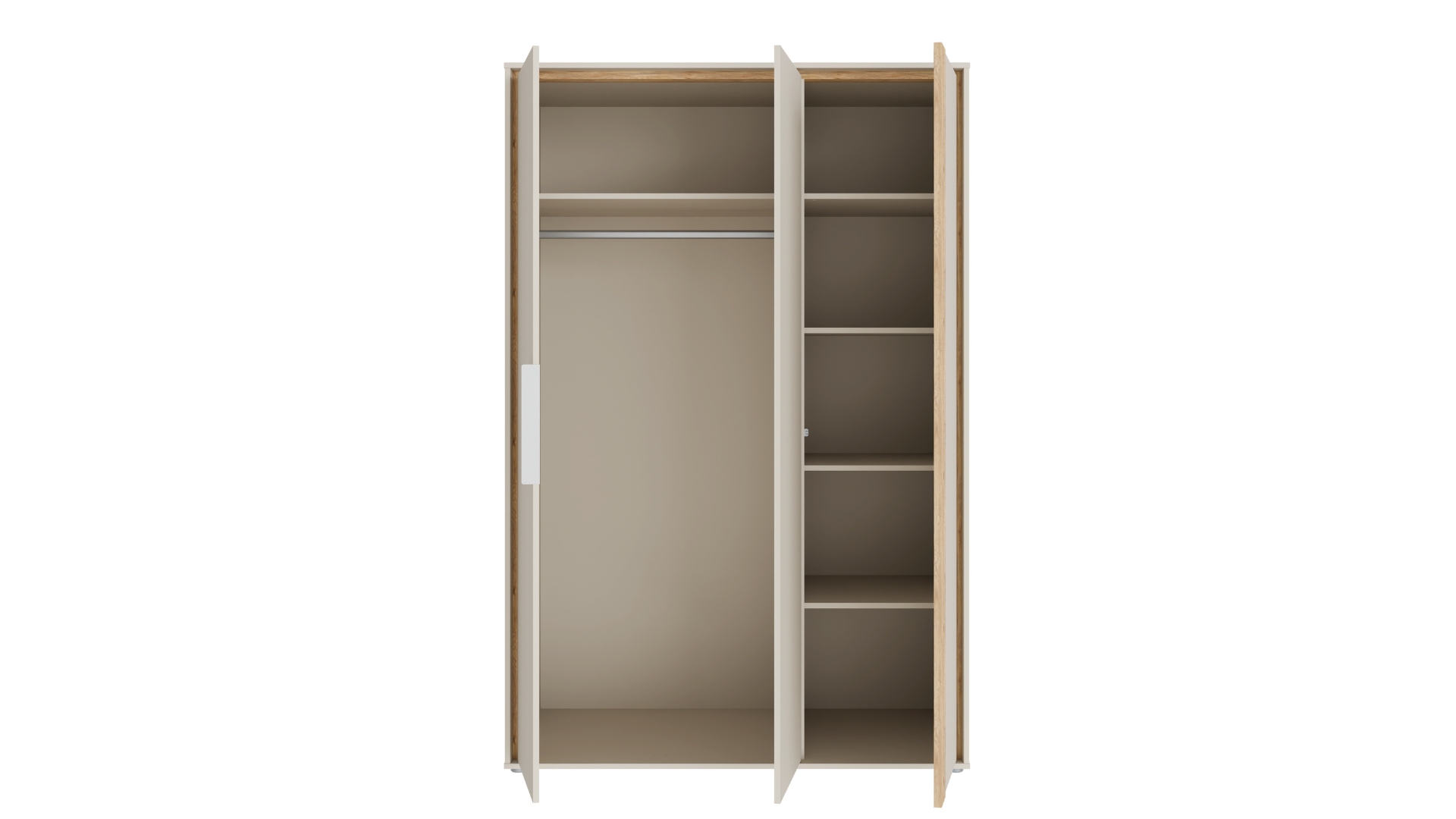 Гардеробът Векслин е идеалното решение за всеки, който търси модерен, функционален и добре организирано място за съхранение на дрехи и аксесоари. Трите врати снабдени с пуш механизъм, осигуряват леко и безшумно отваряне и затваряне с едно натискане, което допринася за изчистения дизайн без дръжки.
