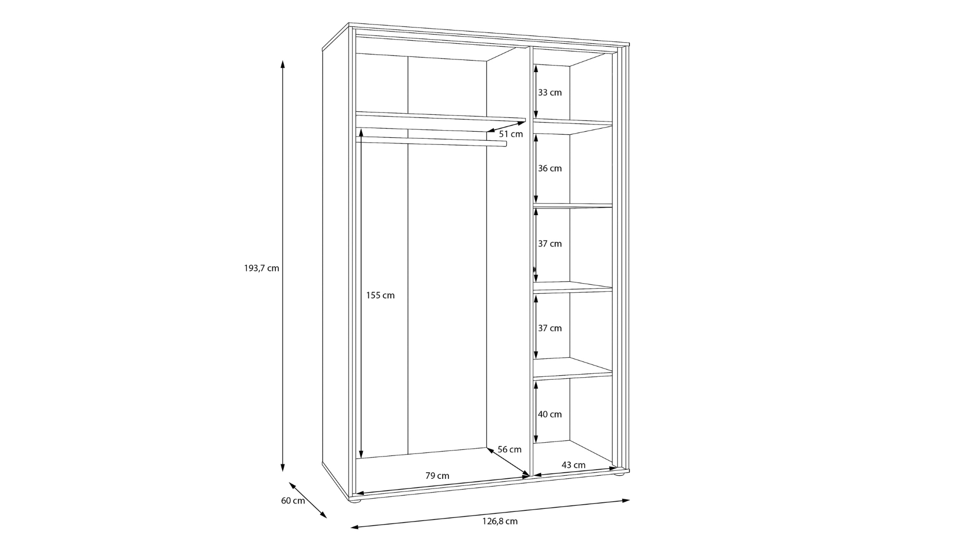 В: 193,7 см Ш: 60 см Д: 126,3 см