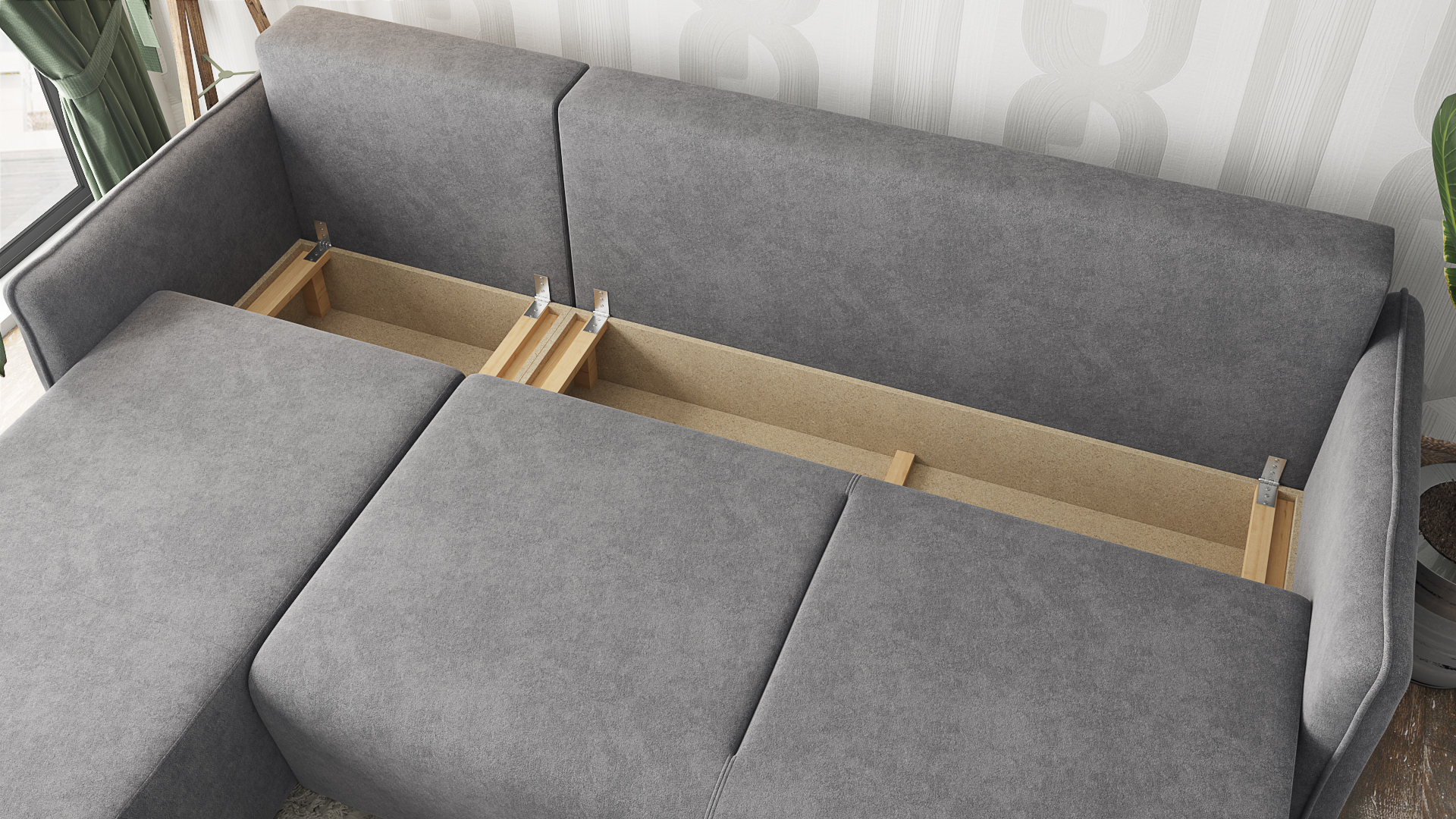 Моделът разполага с функция сън, която се активира чрез падащ гръб, превръщайки дивана в удобна и просторна спалня с площ 146/233 см – подходяща както за гости, така и за ежедневно ползване. Вградената ракла осигурява практично място за съхранение на завивки, възглавници и други вещи, без да заема допълнително пространство.