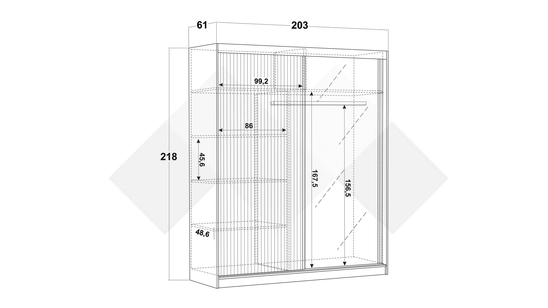 Гардеробът е плъзгащи врати, за да ти спести място и голямо огледало на една от вратите, за да може да погледнеш цялостно своята визия. Зад Вратите ще откриеш функционално място за организиране на твоите дрехи и вещи - пет рафта, за да съхраниш сгънати дрехи и един лост за закачалки, за тези, които искаш да са готови веднага или просто да прибереш връхните си дрехи.