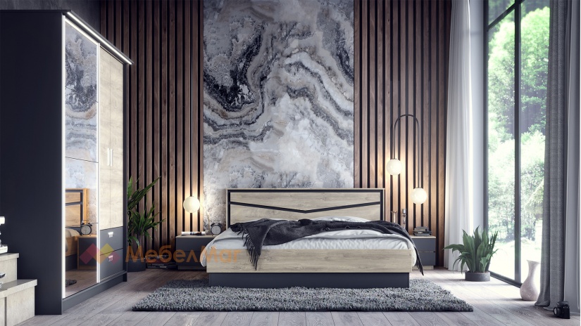 ✓ модерен декор ✓ гардероб с огледало ✓ спалня с нощни шкафчета ✓ механизъм за повдигане на матрака ✓ качествена изработка ✓ 16 мм ПДЧ