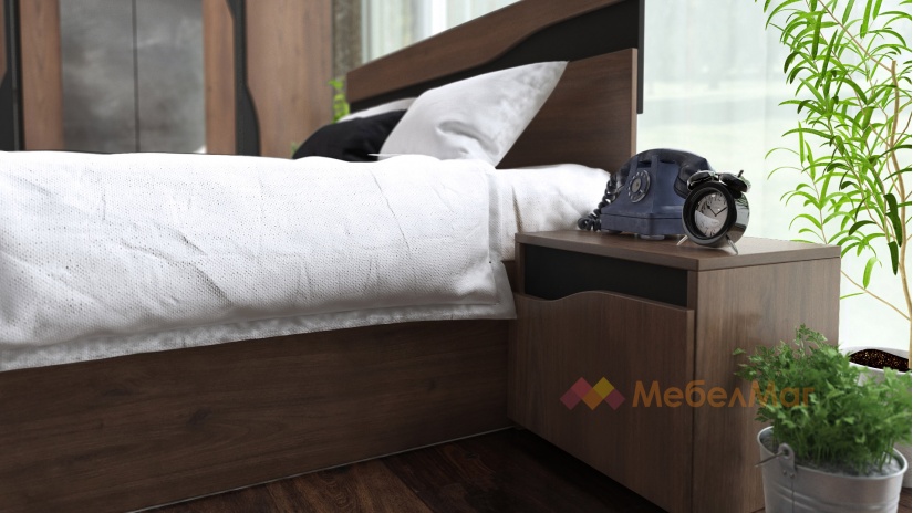 Спалнята е подходяща за матрак с размери 160/200 см, което я прави достатъчно голяма и удобна за спокоен нощен сън. Ефектната табла е достатъчно висока, за да се облегнеш спокойно, гледайки любимия сериал или предаване. Нощните шкафчета придават завършеност на модела и ти предоставят удобно място за съхранение на личните ти вещи, които искаш да са ти винаги под ръка.