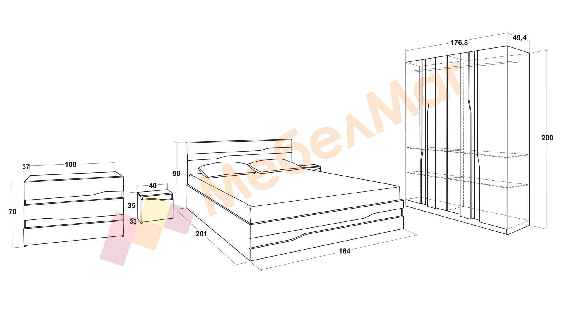 Спалня: Д: 201 см Ш: 164 см В: 90 см