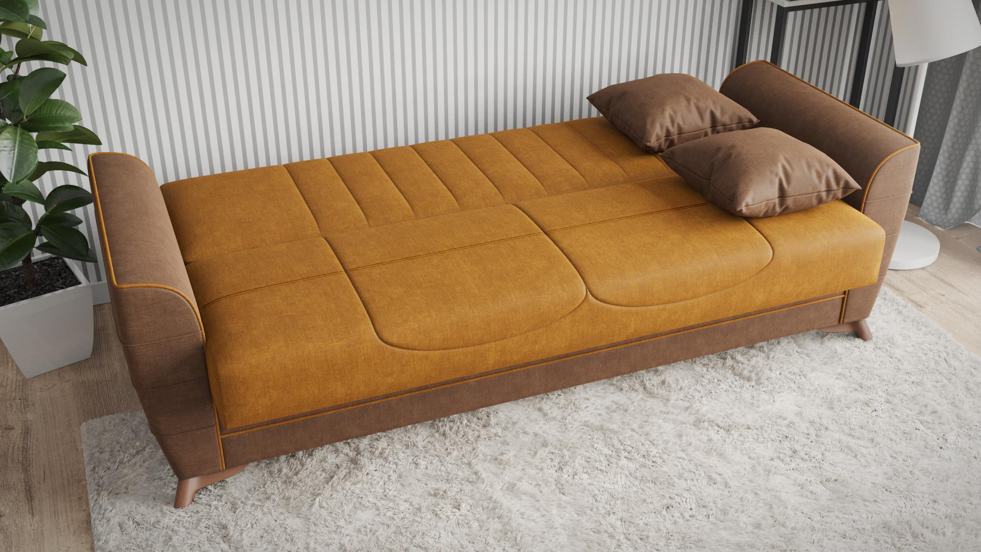 Диван Ялта е и функционален – с минимално усилие, за миг се превръща в широко легло, благодарение на клик-клак механизма, а под седалката се крие просторна ракла, където да съхраняваш завивки, възглавници и други вещи. Дамаската е приятна на допир, изработена от здрав, устойчив на износване и замърсявания текстил, а цветът допринася за неговата уникална идентичност.