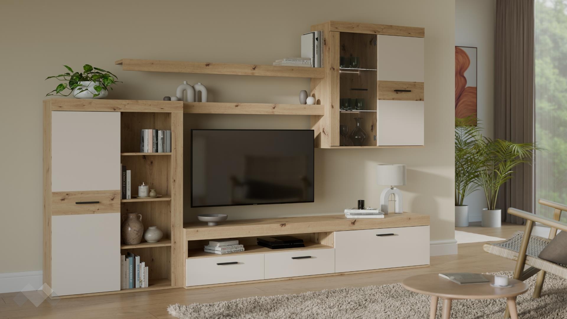 Моделът включва ТВ шкаф с дължина 204,9 см, подходящ за телевизори с различни размери, както и множество шкафове, етажерки и отворени рафтове за организиране на техника, книги или декоративни елементи. Вградената витрина придава допълнителна елегантност, а LED осветлението подчертава модерния характер на цялата композиция.